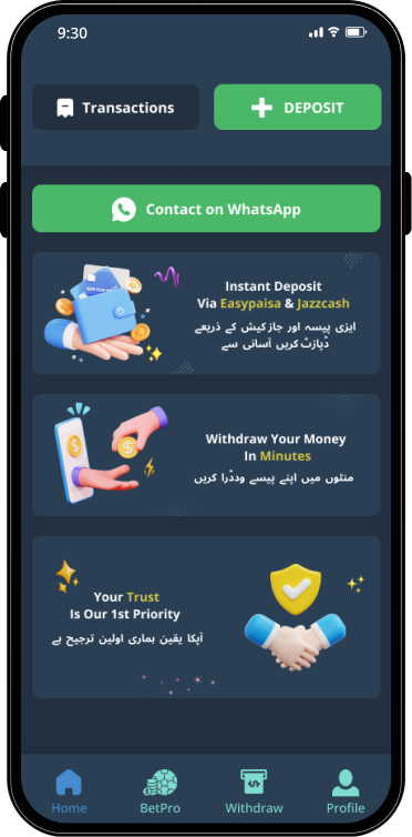 With support for various payment methods including JazzCash, EasyPaisa, and bank transfers, the BetPro Wallet makes it easy to fund your account and access your money whenever you need it. Our app is tailored to meet the needs of modern bettors, providing a seamless experience that you can rely on.